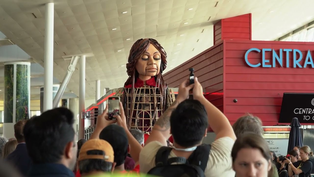 After stops in Turkey, Greece, Italy, Switzerland, Germany, Belgium, France and the UK, Little Amal landed in New York City, where members of the Metropolitan Opera Orchestra and Children’s Chorus serenaded her with Evening Song from Philip Glass’ opera Satyagraha as she passed through John F. Kennedy International Airport.